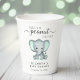 Cute gender-neutral paper cups for your baby shower with "A Sweet Little Peanut Is On Its Way" written in a mixture of soft grey modern typography and stylish script, and a pastel mint green watercolor of a baby elephant. Personalize the mother-to-be's name and shower date in simple grey typography.