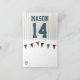 Baby shower de baseball mignon merci les voitures avec le drapeau rouge et bleu, la chauve-souris de baseball, le ballon et la plaque maison et le nom et le maillot numéro année de naissance du bébé sur la crème et bandes bleues sur le dessus intérieur de la carte. Oeuvre © Chrissy H. Studios, LLC. Tous droits réservés.