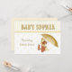 Baby shower invitation in in yellow with cute duck holding umbrella and soft yellow heart and stripe background.