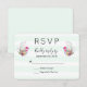 A RSVP card with a cute watercolor illustration of an egg sitting inside a wicker basket. Decorated with ribbons, bows, flowers and little hearts too. A pink flamingo and white bunny rabbit sit on either side waiting patiently for the big day. Pale green stripes on the background.