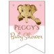 This Gold/Pink elephant design is part of a line of baby shower products including invitations, thank you's, diaper raffle cards, bingo cards, Jelly Belly tins, cake pops, stickers, favour bags, paper plates, paper napkins, and more.