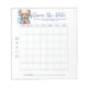 Enhance your baby shower with a custom and personalized guess the date game activity. Guests try to select the correct birthdate. This is a calendar style without the actual numbers shown. Guests can write in the date themselves, or you can opt to include the numbers depending on the desired month. The one who chooses correctly wins a prize. Comes in a notepad style of 40 single side tear-away pages. There is even space for participants to provide their names to refer to later. Teddy Bear Blue Design. Adjust or change the text as needed. Use the template to create your own baby shower guess the date game.