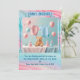 Baby shower invitation card with pink and blue motifs. You can see some baby clothing hanging from a string surrounded by balloons, and a table with some baby items on top. Customizable card.