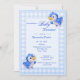 Baby invitation with blue gingham plaid and sweet baby blue birds.
