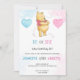 Baby shower invitation featuring a bear hugging a red heart balloon, with blue and pink accents. Text reads: "He or She, What Will Baby Be?"