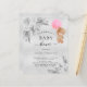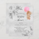 For a modern boho style baby shower. A faux silver looking background. Decorated with non-coloured roses, pampas grass and a teddy bear girl holding a pink balloon. Personalize and add a name and party details.