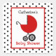 A baby shower sticker featuring an illustration of a red baby carriage over a background of white with black polka dots. Personalize with your name.