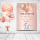 For an elegant Baby Shower. A rose gold gradient background. Decorated with rose gold, pink drips, paint dripping look, party streamers, balloons and a cute elephant baby girl. Personalize and add names and a date.