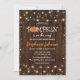 Rustic fall baby shower invitations featuring a wooden background, string twinkle lights, a halloween pumpkin and a modern text template that is easy to personalize.
