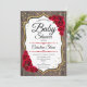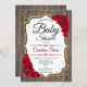 Baby Shower Invitation. Rustic design with wood pattern and faux glitter gold. Features trendy script font, red roses and confetti. Perfect for a stylish gender neutral baby shower.
