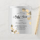 A modern, elegant gender neutral baby shower invitation. Faux silver metallic looking background decorated with golden eucalyptus sprigs. Personalize and add a name and party details. Black coloured letters.
