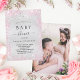 A modern, elegant baby shower, celebrating a baby girl. Faux silver looking background decorated with pink faux glitter. Personalize and add a name and party details. Black coloured letters.