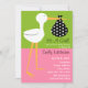 A baby shower invitation featuring an illustration of a stork carrying a black bundle with white polka dots. Background is green on top half and pink on bottom half. Personalize the text with details of your occasion.