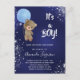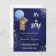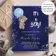 For a baby shower celebrating a baby boy. A navy blue background, the blue colour is uneven. Decorated with faux silver glitter dust. A teddy bear holding a light blue balloon. Personalize and add the name of the mom to-be and party details. The name and the text: It's a Boy! are written with a hand lettered style script.