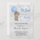 For a baby shower celebrating a baby boy. A faux silver looking background. A teddy bear holding a blue balloon stars. Personalize and add the name of the mom to-be and party details. The name and the text: Oh Boy! and Bearly are written with a hand lettered style script