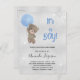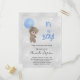 For a baby shower celebrating a baby boy. A faux silver looking background. A teddy bear holding a blue balloon. Personalize and add the name of the mom to-be and party details. The name and the text: It's a Boy! are written with a hand lettered style script.