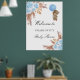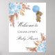 A welcome poster for an elegant and modern baby shower. A white background, boho style pampas grass, light blue florals and a teddy bear boy holding a blue balloon. Personalize and add a name.