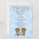 It's Twins! Adorable personalized boy twins baby shower invitation. Just fill in the details and you're all set to go. Baby blue background, A Twins banner and twin teddy bears playing with baby toys. All our products can be custom designed to meet your needs at no extra charge. Simply contact us through our store. Coordinating products available: Just ask us!