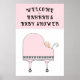 Cute baby shower welcome poster featuring baby girl and pink piano stroller. To personalize edit text to add mother-to-be's name.