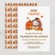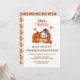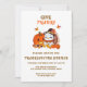 This delightful Thanksgiving invitation with this festive design, showcasing a cheerful baby turkey and a smiling pumpkin surrounded by vibrant autumn leaves and a tempting array of desserts.