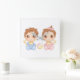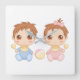 Cute cartoon babies, boy and girl, in blue and pink rompers and yellow bibs holding matching rattles.