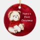A cute teddy bear on a Christmas ornament. The ornament has the customizable text "Name's First Christmas" and templates for your personalization.