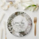 This disposable paper plate features a beautiful photo of miniature white carnations and baby's breath as the background. White customizable text, in the centre, allows you to personalize with the names of the bride and groom and their wedding date.