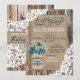 Rustic country western bridal shower card design with baby's breath and teal and navy hydrangea bouquet in mason jar with burlap and lace tied in navy blue twine and white lace over aged wood planks.