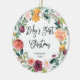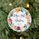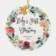 This beautiful Christmas ornament says "Baby's First Christmas" in trendy handwritten script, on a clean white background. A rustic watercolor floral wreath with flowers in shades burgundy, marsala, orange, peach, and blush circles the edges. The back of the ornament has a spot for your baby's photo.