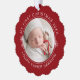 Modern keepsake baby's first Christmas personalize paper ornament in curve letters and line art of snowflakes overlaying a festive red with your favorite photo.