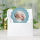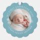 Modern keepsake baby's first Christmas personalize paper ornament in curve letters and line art of snowflakes overlaying a dusty baby blue with your favorite photo.