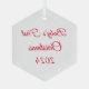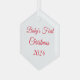 This Christmas glass ornament is shown in the hexagon shape with text: Baby's First Christmas and date in a red colour.