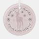 Modern baby dusty pink ornament for baby's first Christmas personalize with baby's name, year, deer with a bow, snowflakes and curve lettering in serif font.