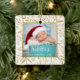 Celebrate baby's first Christmas with this beautiful keepsake ornament. Easily replace the sample image with your own favorite photo and customize it with baby's name in white handwriting font and the year below. (The design works best with photos that have a dark background in the lower area.) The photo is framed by an elegant square frame decorated with hand-drawn gold foliage on a white background.