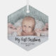 Celebrate the simple joys of your newest family member with a custom photo "My First Christmas" hexagon-shaped glass ornament. Gender neutral design is suitable for a new baby boy or girl. Picture and all wording on this template are simple to personalize. The modern minimalist black and white overlay design features one image of your choice and a handwritten style script typography message, name and year. This unique family keepsake adds an elegant touch to Xmas home decorations.