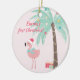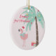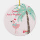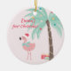 NewParkLane - Baby's First Christmas Ornament, featuring two a tropical scene with a cute pink flamingo wearing a Santa hat, and a decorated palmtree with Christmas presents, against an blush pink background.