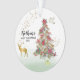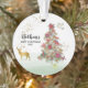 PERSONALIZE Christmas round ornament commemorating Baby's First Christmas. You can customize the Name of the Baby, The year of baby's birth and on the back "Now We Are "number". The are gold sparkles and faux glitter on the tree. The front has a PEACE DOVE and a decorated Christmas Tree. The tree has many red poinsettias. There is a faux gold buck deer in the background with a nice rack of antlers. One gift by the tree is waiting to be opened.