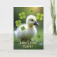 This card shows a fluffy pale yellow chick centered against a softly blurred green backdrop, giving the scene a gentle spring setting. The chick’s tiny dark eye angles toward a warm golden glow in the upper right, like it’s sharing a quiet, affectionate glance with the light. Around it float several bright green four-lobed leaf shapes, some sharp and some faded into the background, adding a sweet, friendly mood 🌷. The lighting stays soft and golden, highlighting the chick’s down and creating a cozy contrast with the cool greens behind it. Along the bottom, the phrase “Baby’s First Easter” appears in large gold letters with a luminous look, standing out clearly against the darker edge of the scene. The text is centered near the lower border, leaving the chick unobstructed and making the message easy to read. A few of the green leaf shapes drift near the chick’s head and shoulders, while others fade into the distance like soft bokeh 🐇.