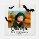 Baby's First Halloween Black Bats Photo Ceramic Ornament. A custom baby's name in a trendy script and 3 black bats. Personalize the ornament with your baby's photo, name and year. A lovely Halloween holiday keepsake.