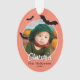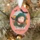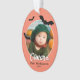 Baby's First Halloween Black Bats Photo Ornament. A custom baby's name in a trendy script and 3 black bats. Personalize the ornament with your baby's photo, name and year. A lovely Halloween holiday keepsake.