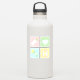 Four squares in soft pastels of pink, green, blue, and yellow are framed by a white design like stitch marks and decorated with cute, baby-themed icons of a bottle, diaper, rattle, and bib.