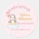 A sweet cute Babysitter Nanny Business sticker. Adorable baby penguin sitting on a cloud whilst holding a pink balloon with a pink cloudy background. All text can be customized to your own requirements - using a pink and gold coloured text. Add your contact information, name, mobile and email address. Simple, colourful design for babysitters.