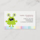 C'est un carte de visite de baby-sitter avec un mignon alien de monstre vert sur le côté gauche de la carte. Il y a une bordure rayée pastel au bas de la carte, avec votre nom, titre et coordonnées de base sur le côté droit de la carte.