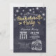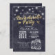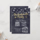 Bridal Shower / Wedding Celebration Invitation Card Templates - Elegant Bachelorette Party Gold Lettering Script and Vintage Mason Jars and String Lights on Navy Blue Floral Linen Background.