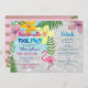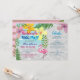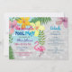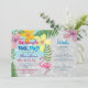 Piscine moderne et tendance Bachelorette invitation à la fête avec flamand mignon, itinéraire personnalisé et fleurs colorées d'aquarelle, et feuilles de palmiers.