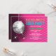 © Socialite Designs Inc. Celebrate the bride-to-be bachelorette party by sending out these fun pink and silver disco ball party invitations. Easily customize the text for your event by replacing the template text. Design incorporates a silver disco ball, pink background with reflections and starbursts that can be moved and resized. The text is made to look like neon lights.