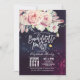 Bachelorette Party / Bridal Shower Invitation Card Template - Elegant Watercolor Natural Boho Floral Feather and Handwritten Script on Purple Sparkle Bokeh Lights Background.