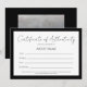 Editable certificate of authenticity template that you can customize with your artist or business name and details. Add your artwork image to the back of the card. Elegant, classic and minimalist black and white design that complements many branding styles. Printable downloadable file and/or custom printed certificates in a variety of finishes.