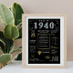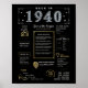 Take a voyage back to 1940 with our enchanting digital poster, overflowing with historical facts, notable news, and fascinating anecdotes from days gone by. Adorned with faux gold and silver embellishments against a striking black backdrop, embellished with unique icons and daring typography, this poster emanates timeless charm. Whether sparking conversations at birthday gatherings or anniversaries, or when elegantly displayed, it transforms into a cherished heirloom, infusing any space with a nostalgic allure.
