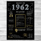 Step into 1962 with our captivating digital birthday poster, brimming with historical facts, noteworthy events, and intriguing stories from the past. Adorned with elegant gold and silver details set against a bold black background, featuring unique symbols and stylish text, this birthday poster exudes timeless charm. Whether sparking conversations at birthday gatherings or cherished as a keepsake, it evokes nostalgic memories.